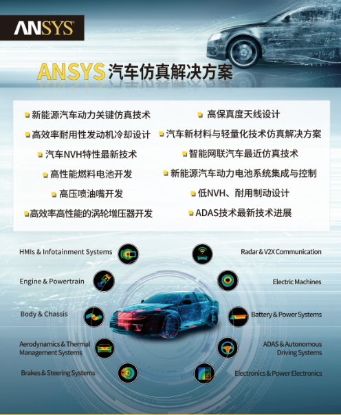 新能源汽車大多由幾千個零部件組成,結構極其復雜,在仿真設計和研發過程中會涉及到流體、結構、溫度、電磁和控制等多個領域。美國ANSYS公司(AUTOMOTIVE WORLD CHINA 2018,2A10)研制的汽車仿真解決方案,覆蓋新能源汽車、發動機冷卻、汽車新材料、智能網聯汽車、燃料電池各個版塊。公司依靠先進的研發手段與傳統試驗和設計經驗相結合,形成互補,有效指導新產品的研發設計,節省產品開發成本,有助于大幅提高企業的市場競爭力。