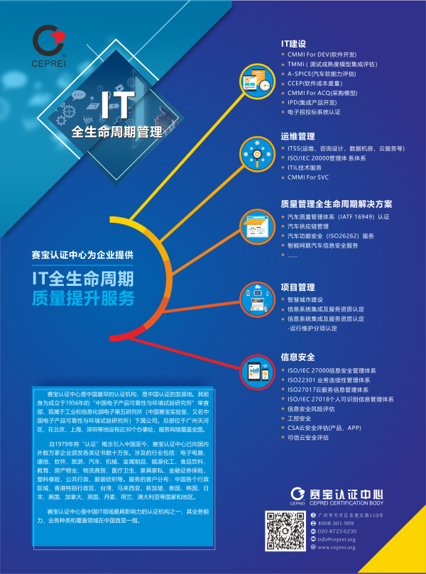 賽寶(AUTOMOTIVE WORLD CHINA 2018,展位2A35)認證中心是經中國認監委批準、國內外多個組織認可和授權的權威認證機構,現屬于工信部電子第五研究所。賽寶認證中心致力于幫助汽車企業制定質量管理全生命周期解決方案,包括汽車質量管理體系(IATF 16949)認證、汽車供應鏈管理、汽車功能安全(ISO26262)服務、汽車軟件研發管理(Automotive SPICE)咨詢認證服務、智能網聯汽車信息安全服務、智能制造等業務。通過賽寶認證中心全生命周期服務,可為企業提供系統的質量管理解決思路。