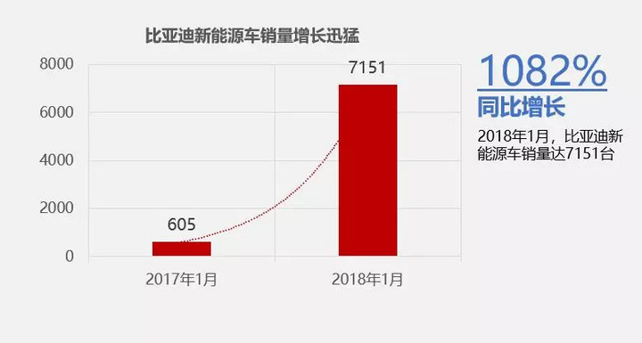 2018年1月比亞迪迎來開門紅,在秦、唐、宋DM等主力新能源車的帶動下,比亞迪新能源車1月銷售7151輛,同比增長1082%。